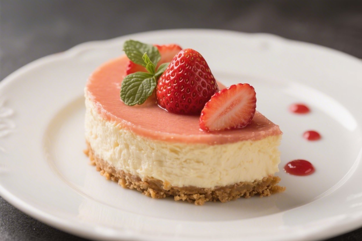 12. Assemble and serve: Remove the cheesecake ring. Spoon cooled strawberry topping over the cheesecake. Garnish with fresh berries and dollops of whipped cream. Slice with a hot, clean knife for neat edges.