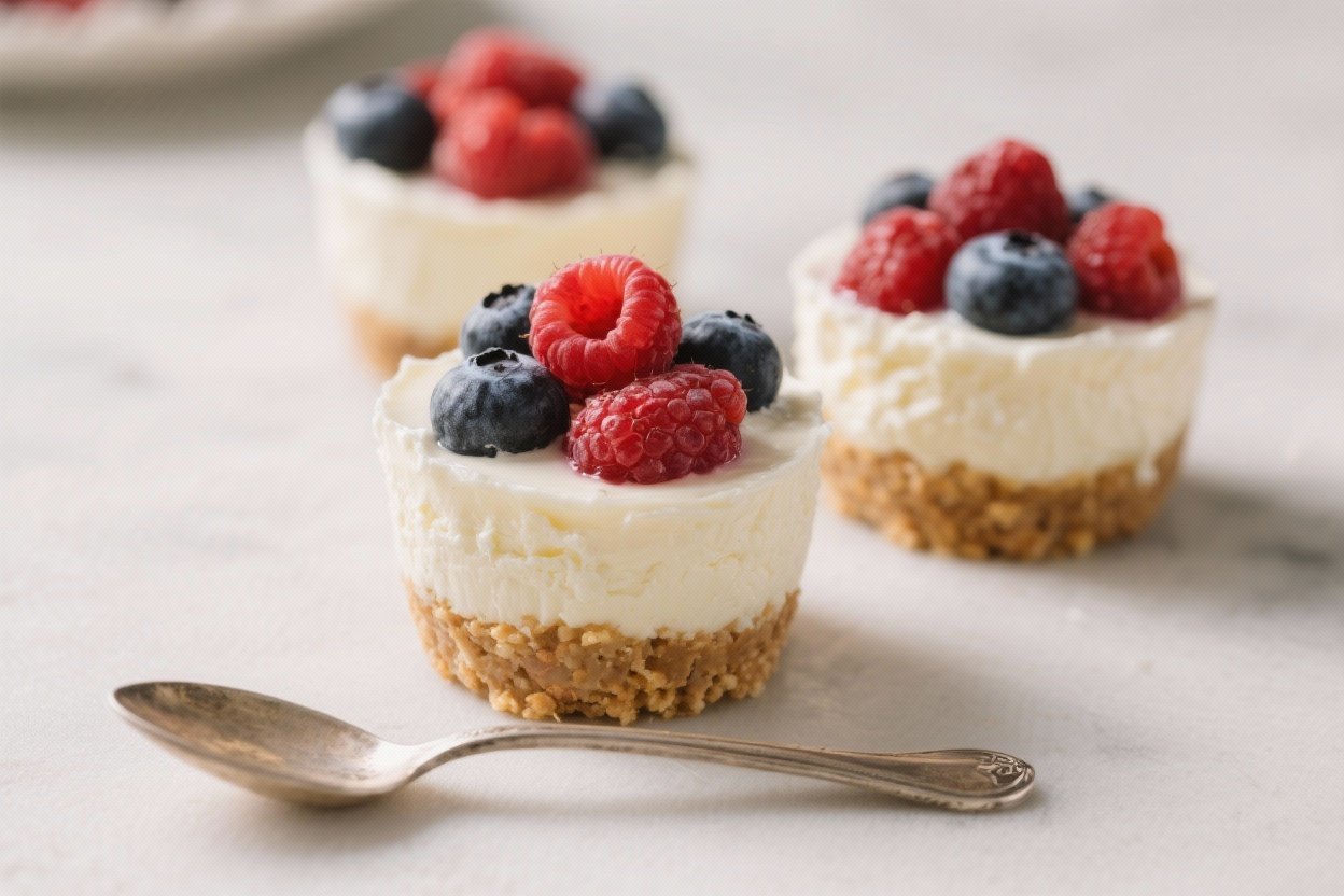 9. Top and serve: Spoon berries over each cheesecake cup. If you like, add a tiny drizzle of honey or a swirl of berry jam for extra color and shine.