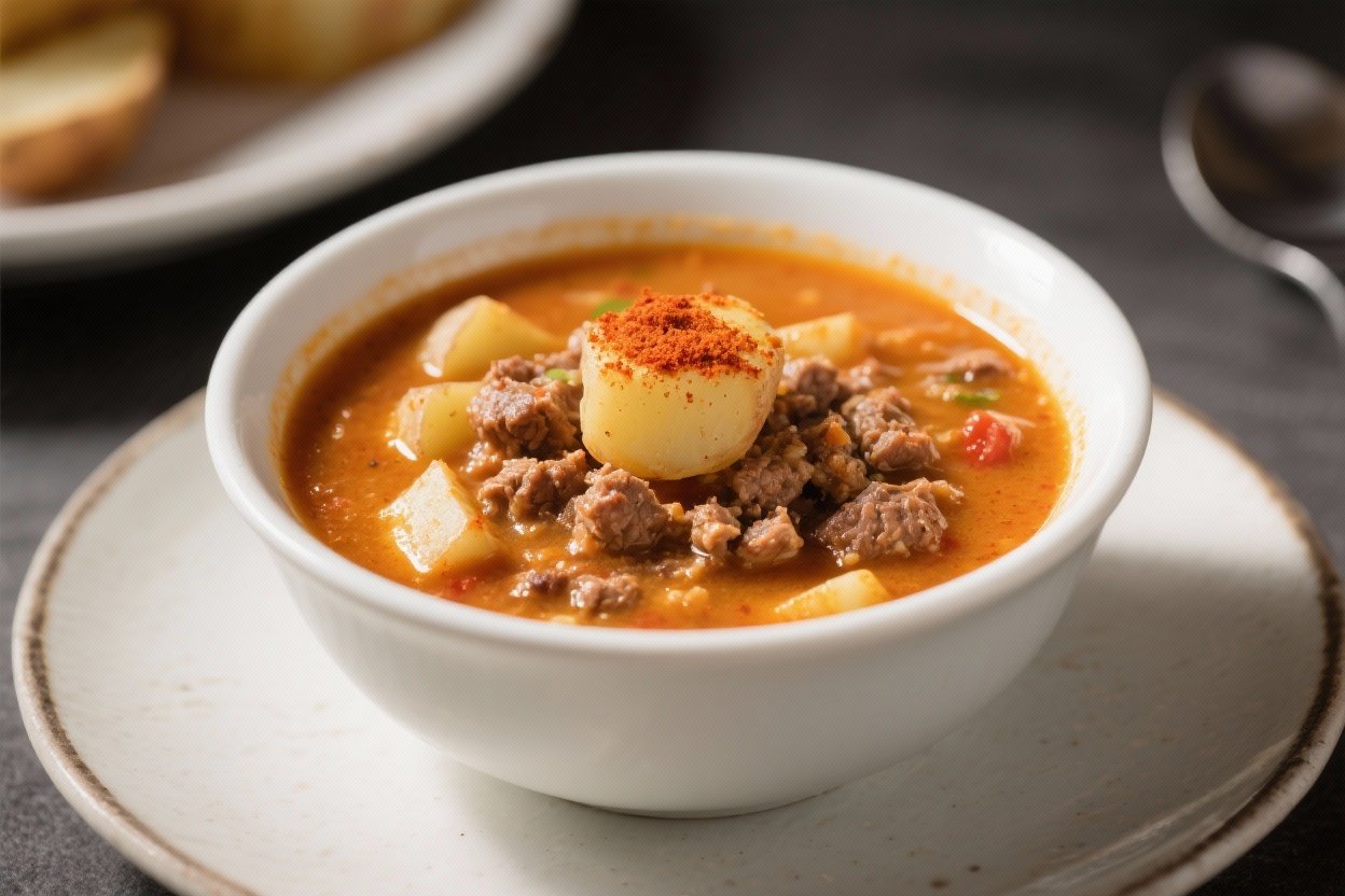 This is the kind of soup you make when the weather turns chilly and you want something hearty without a lot of fuss. It’s rich, savory, and full of tender potatoes and seasoned ground beef, with a warm smokiness from paprika that brings the whole pot together. The broth is creamy without being heavy, and every spoonful feels like comfort food done right.